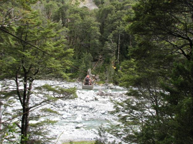 Vyrazili jsme. Cesta nás vedla prvně proti proudu řeky Waimakariri – širokým údolím, jaká jsou tu v horách běžná – potom jsme měli vystoupat údolím řeky Taipiti do Harmann saddle, tam překročit rozvodí a klesat od pramenů řeky Taipo až do jejích nižších částí a potom opět nahoru na Carrol hut a zase dolu k autu. Celý track měl něco přes 45 km. Počasí nebylo nic moc, ale stejně jako meteorologové i my jsme důvěřovali australské výši. Waimakariri měla spoustu přítoků a bočních ramen a její koryto bylo široké přes celé několikakilometrové údolí. A tak jsme brodili a skákali přes kameny a vyhlíželi sluníčko. A ono skutečně přišlo Vydatná přeháňka ukončila nadvládu dešťových mraků, my schovali pláštěnky a nechali se rozehřívat večerním sluncem. Za dalším z říčních ohybů na nás vykoukla Carrington hut – jedna z několika chat určená pro přespávání turistů. A protože jsme v ní byli jediní, neřekli jsme její nabídce ne. Jak se udělala tma a vzduch se rychle ochladil, začalo v ní příšerně praskat a loupat a když se k tomu ještě na střeše začali honit oposumové, spalo se tam jak ve strašidelný mlejnici. Ráno jsme se probudili do husté mlhy, kterou postupně začalo protrhávat sluníčko. Věděli jsme, že my i australská výše máme vyhráno! Aspoň prozatím. Cesta nás vedla dál proti proudu řeky a dovedla až k místu brodu. Protože po předchozích deštích nebylo vody zrovna málo, zvolili jsme raději suchou variantu a to s velkou zvědavostí. Tentokrát se žádný lanový most nekonal. Místo toho bylo přes řeku natažené lano, na kterém seděl vozík a na obou koncích (výstupu a nástupu na konci údolí) byly ruční navijáky. Pro případ, že pocestný je sám, byly ve vozíku ještě železné přitahováky. A tak jsem nasedla, oba jsme se zhluboka nadechli a Jiřík mě vypustil v kabince po lanu doprostřed hlubokého údolí. Svištěla jsem vzduchem a říkala si, jak dlouho už tam to lano asi visí… a jak dlouho ještě bude. Zůstalo tam naštěstí i po obou našich průletech... udělala jsem si náčrtek. Měli bychom tohle obveselovadlo zapojit na naše ratmírovské čarodějnické srazy.