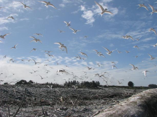 Lososy jsme šli chytat na Waitaki. Řeku s širokánsou deltou ústící přímo do Pacifiku. Pár dní před víkendem docela pršelo, takže hladina byla vysoko a zdálo se, že pořád ještě stoupá. Místní jsou tady na to ale dobře připravení a většina velkých řek tu vypadá spíš jako ohromné vádí, které se naplní jen několikrát do roka. V záplavových oblastech mají jenom pastviny, takže jim nic vážného nehrozí. Moře bylo jako vždy dost bouřlivé a plné sargasu. Prý šlo najít i vyvržená žraločí vajíčka a asi jsme jich skutečně i pár našli. Mnohem větší radost než z vajíček jsme ale měli z objevu Paua mušlí, kterých tu bylo pohazených slušné množství a tak jsme sbírali a strkali si je do kapucí od bundy, protože nic jiného jsme s sebou neměli. Njn, lososi tu ale nebyli. Prý na horách ještě neroztál sníh a tak čekají, až se koryta řek naplní na maximum a pak vyrazí na svojí hladovou sexuchtivou pouť. A tak jsme okoukli místní garnátníky, chlápky co jen tak sedí u vody, mají tam položené sítě a tváří se strašně sveřepě a důležitě, ačkoliv mají sítě úplně prázdné. Vyplašili kolonii racků a vraceli se k autu. Řeka Waitaki však mezitím nastoupala o další metr a půl a zamkla nás na malém poloostrově, vlastně pak už ostrově, mezi mořem a pevninou. S kapsami a kapucemi plnými lastur jsme polonahatí brodili plni úzkostného očekávání, jestli nás nepřepadně nějaký ten lidožravý úhoří macek – dobrodružnou story, jak Jirku lovili úhoři, sepíše Jiřík prý co nevidět. Naše úlovky byly veškeré žádné, ale to nám nevadilo, protože jsme našli v mapě krásné jezero, u kterého by se dalo nocnout i nachytat a opéct večeře. Cestou k němu jsme projeli okolím Dunedinu [Danejdnu] a viděli NZ lesy. Ó ty český smrčáku, borůvčím a podhoubím vonící, jak jsou krásné krovy tvoje! To co je tady je teda hanba lesního hospodářství. Holosečná těžba borovic úplně na skelet, to člověku jde mráz po zádech, jak tady plundrujou půdu a podporujou intraskeletární erozi (Bětuš ;) to je slovíčko pro Tebe do